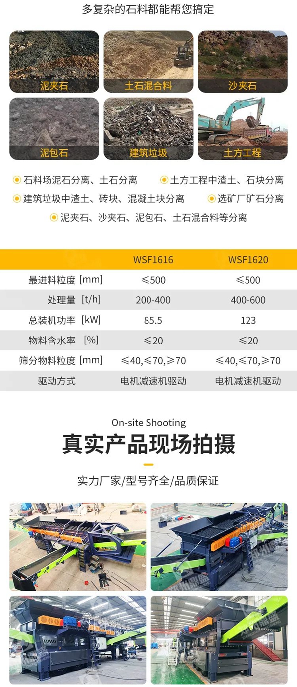 如果選用傳統(tǒng)的振動篩和螺旋洗礦機(jī)作為泥石分離機(jī)可以嗎?有些可以,有些根本無法做到。振動篩可以篩分粒度相差不大的泥土和碎石,對于大塊石頭和泥土分離難以做到,而且對于粘性高的泥土石頭分離幾乎不可能做到;螺旋洗礦機(jī)可以分離一定粘性的泥土和石頭,但是需要大量的水,對于許多缺水的礦山來說,又是一個非常頭疼的問題,甚至無水的時候,項目必須擱淺,無法開發(fā)。
