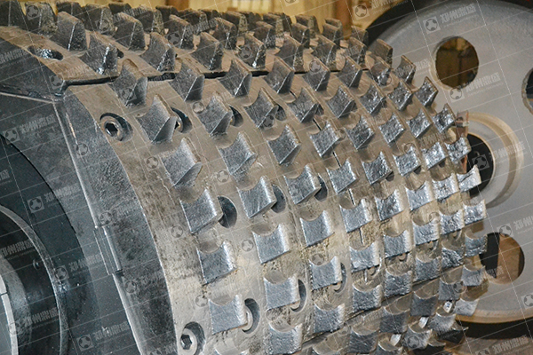 每組齒輥由六塊月牙形的破碎齒板、通過高強度螺栓與輥軸上的固定架聯(lián)接而成,破碎齒板采用高強度、高強度耐磨合金鑄鋼鑄鋼制造,齒部表面經(jīng)滲碳、氮化處理滲透深度>3mm,具有可靠的耐磨性能和高強度的抗沖擊性能,連續(xù)使用壽命達20000小時以上,齒板磨損后便于更換。