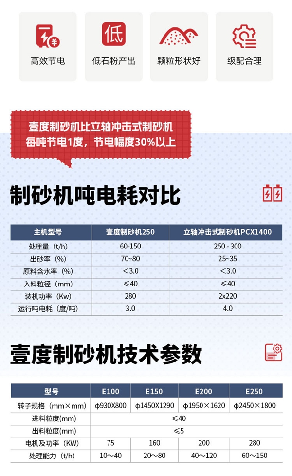 壹度制砂機(jī)與“石打石”沖擊式制砂機(jī)相比,節(jié)電可達(dá)30%,且出砂成品質(zhì)量優(yōu)良,符合國標(biāo)二區(qū)標(biāo)準(zhǔn)。