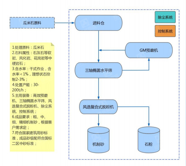 瓜米石俗稱為石沫,顆粒大小與綠豆相似,是一種碎石料,又稱為石粉、豆石,因品相與瓜子片相像,顆粒小而又常見(jiàn)于針片狀存在,所以限制了其的使用領(lǐng)域,給骨料銷售帶來(lái)困難,時(shí)常于低價(jià)格或者廢棄料處置。為幫助客戶解決瓜米石使用面窄,處置價(jià)格低,銷售困難的問(wèn)題,鼎盛公司抓住客戶困境重視客戶體驗(yàn),并根據(jù)瓜米石顆粒粒度小,再處置破碎困難,處置成本高,細(xì)篩分困難等的特性,且在干法作業(yè)與濕法作業(yè)的選擇中,選擇干法脫粉保證生產(chǎn)工況,通過(guò)一系列設(shè)備改良,工藝優(yōu)化組合,推出瓜米石專用干法制砂系統(tǒng),逐步解決上述問(wèn)題,將低價(jià)格的廢棄瓜米石,一舉成功轉(zhuǎn)化成高性價(jià)比的人工機(jī)制砂。