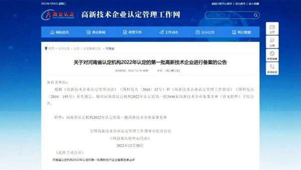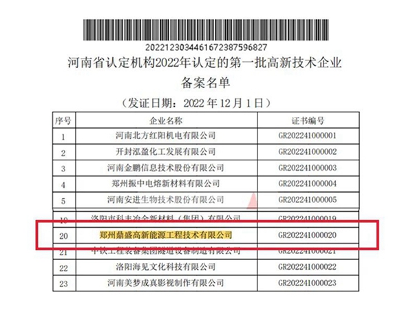 2022年12月30日,全國高新技術(shù)企業(yè)認(rèn)定管理工作領(lǐng)導(dǎo)小組辦公室,公布了《河南省認(rèn)定機構(gòu)2022年認(rèn)定的第一批高新技術(shù)企業(yè)備案公告名單》。鄭州鼎盛高新能源工程技術(shù)有限公司(以下簡稱“鄭州鼎盛”)名列其中,順利通過“國家高新技術(shù)企業(yè)”復(fù)審認(rèn)定。