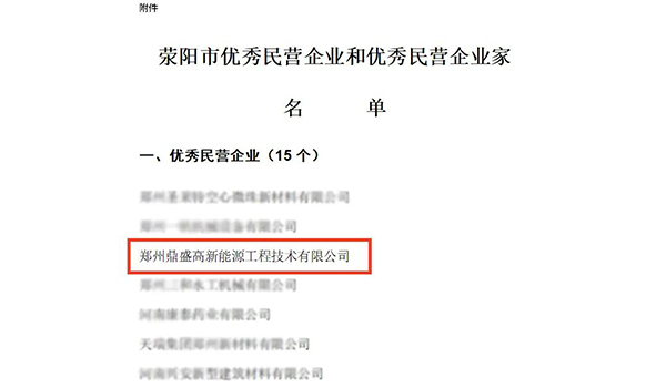 近日,中共滎陽市委公布了《關(guān)于滎陽市優(yōu)秀民營企業(yè)和優(yōu)秀民營企業(yè)家》的名單。鄭州鼎盛高新能源工程技術(shù)有限公司(以下簡稱“鄭州鼎盛”)榮獲“滎陽市優(yōu)秀民營企業(yè)”榮譽(yù)稱號(hào)。
