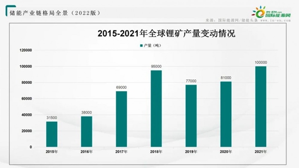 從供應(yīng)量上看,2021年全球鋰礦石產(chǎn)量約為10萬噸(不包括美國),較2020年的8.25萬噸增長21%。2021年全球鋰資源消費(fèi)量估計(jì)為9.3萬噸,較2020年的7萬噸增長33%。