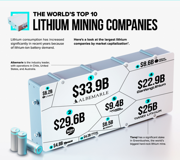 按市值劃分,世界上較大的鋰生產(chǎn)商是美國Albemarle(雅寶),市值達(dá)339億美元。Albemarle Corporation與智利第二大生產(chǎn)商Sociedad Químicay Minera de Chile (SQM)合作,在智利的Salar de Atacama開展鋰礦開采業(yè)務(wù)。Salar de Atacama自1980年代以來便一直從事鋰礦的開采生產(chǎn),目前占據(jù)了全球近四分之一的鋰礦產(chǎn)量。