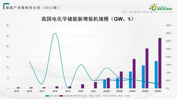 根據(jù)國家發(fā)展改革委、國家能源局發(fā)布的《關(guān)于加快推動(dòng)新型儲(chǔ)能發(fā)展的指導(dǎo)意見》規(guī)劃,2025年我國將實(shí)現(xiàn)新型儲(chǔ)能裝機(jī)規(guī)模 30GW 以上,據(jù) CNESA 保守估測,2026年我國新型儲(chǔ)能裝機(jī)累計(jì)規(guī)模將達(dá)到48.5GW,對應(yīng)2022-2026CAGR為 53.5%。