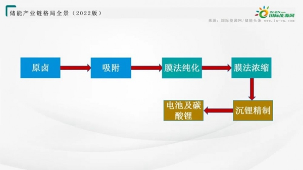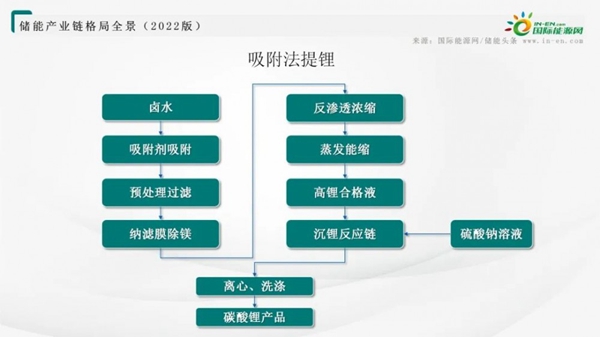 通過對鋰有選擇性的吸附劑吸附鹵水中的鋰,再用淡水解吸與其他雜質(zhì)分離并富集,再通過小型鹽田濃縮后化學(xué)沉淀鋰。