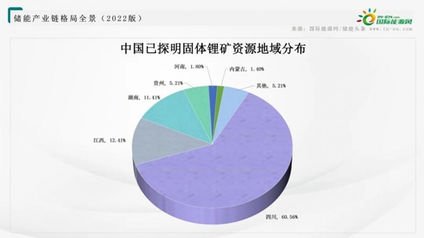 礦石鋰資源分布于四川、江西、湖南、新疆等省份,存儲(chǔ)量約為全國鋰資源存儲(chǔ)量的20%左右,其中四川省的儲(chǔ)量較大,占全國礦石鋰資源儲(chǔ)量的60%左右。
