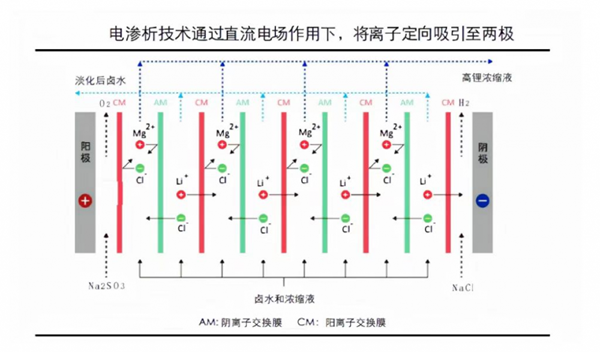 在外加直流電場的作用下,固態(tài)或液態(tài)離子交換膜對水中離子具有選擇性,使水中的一部分離子透過交換膜轉(zhuǎn)移到另一部分水中,從而達(dá)到分離鎂、濃縮鋰的目的。其優(yōu)勢在于可處理高鎂鋰比鹽湖、效率高;難點(diǎn)在于開發(fā)具有優(yōu)選擇性、高鋰容量和高穩(wěn)定性的鋰捕獲材料。