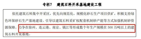 《規(guī)劃》強調(diào)長江經(jīng)濟帶、長三角區(qū)域一體化發(fā)展等國家發(fā)展戰(zhàn)略實施,新型工業(yè)化、新型城鎮(zhèn)化的推動以及大量基礎(chǔ)設(shè)施建設(shè),對礦產(chǎn)資源的需求仍將維持在高 位。砂石資源供需矛盾突出,要統(tǒng)籌實施國家戰(zhàn)略性礦產(chǎn)和江蘇重要礦產(chǎn)的勘查開發(fā),保持一定規(guī)模的礦產(chǎn)開采總量,提高礦產(chǎn)資源保障能力,規(guī)模化開采建筑石料,滿足經(jīng)濟社會發(fā)展需求。