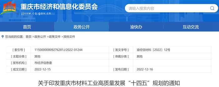 近日,重慶市經(jīng)信委發(fā)布了《關(guān)于印發(fā)重慶市材料工業(yè)高質(zhì)量發(fā)展“十四五”規(guī)劃的通知》。