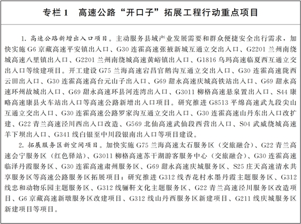 (一)實(shí)施高速公路“開(kāi)口子”拓展工程行動(dòng)。突出高速公路“開(kāi)口子”拓展工程在發(fā)展路衍經(jīng)濟(jì)中的突破性、標(biāo)志性、引領(lǐng)性作用,通過(guò)新增互通立交出入口、改造連接線、拓展服務(wù)區(qū)空間與功能等措施,將封閉的高速公路進(jìn)行多點(diǎn)開(kāi)放,全面提升高速公路的輻射范圍和服務(wù)能力。(省交通運(yùn)輸廳牽頭,省發(fā)展改革委、省政府國(guó)資委按職責(zé)分工負(fù)責(zé),各市州政府、蘭州新區(qū)管委會(huì)、各縣市區(qū)政府及相關(guān)部門(mén)具體落實(shí)。各項(xiàng)行動(dòng)均需各市州政府、蘭州新區(qū)管委會(huì)及各縣市區(qū)政府具體落實(shí),不再逐一列出)