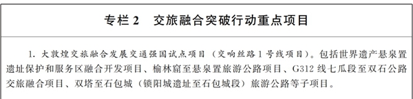 (二)實(shí)施交旅融合突破行動(dòng)。創(chuàng)新“交通+文化旅游”模式,以旅游公路、旅游風(fēng)景道、運(yùn)輸場(chǎng)站、服務(wù)區(qū)等建設(shè)和優(yōu)化升級(jí)為抓手,探索交旅融合發(fā)展新路徑,打造“景道互聯(lián)”“客源互送”“快進(jìn)慢游”的旅游交通網(wǎng)絡(luò)。規(guī)范有序開(kāi)發(fā)路域廣告業(yè)務(wù),加強(qiáng)公益廣告商業(yè)化引導(dǎo),加大美麗甘肅及旅游景點(diǎn)宣傳力度。(省交通運(yùn)輸廳、省文旅廳牽頭,省生態(tài)環(huán)境廳、省林草局、省政府國(guó)資委按職責(zé)分工負(fù)責(zé))