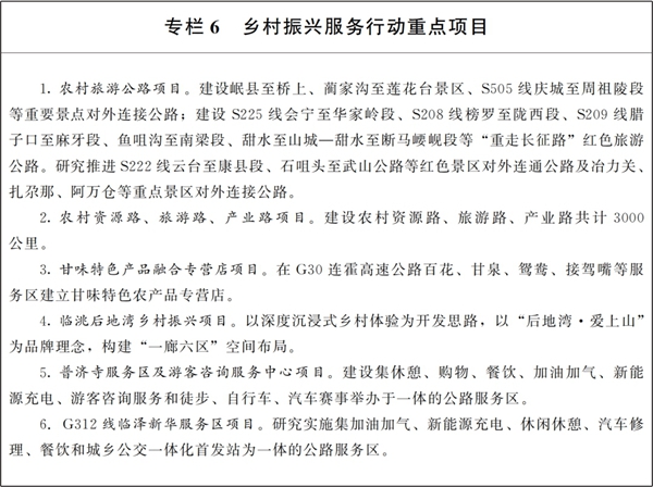 (六)助力鄉(xiāng)村振興服務(wù)行動(dòng)。深入實(shí)施鄉(xiāng)村振興戰(zhàn)略,促進(jìn)農(nóng)村公路與鄉(xiāng)村旅游、現(xiàn)代農(nóng)業(yè)融合發(fā)展,形成特色中藥材、鄉(xiāng)村手工業(yè)、特色食品業(yè)等農(nóng)村特色產(chǎn)業(yè)發(fā)展廊道。在公路服務(wù)區(qū)增設(shè)甘味特色農(nóng)產(chǎn)品專(zhuān)營(yíng)店,讓更多甘味農(nóng)產(chǎn)品走出鄉(xiāng)村、走向全國(guó)。(省交通運(yùn)輸廳、省農(nóng)業(yè)農(nóng)村廳牽頭,省鄉(xiāng)村振興局、省政府國(guó)資委按職責(zé)分工負(fù)責(zé))