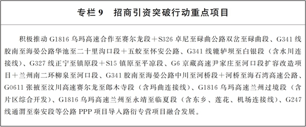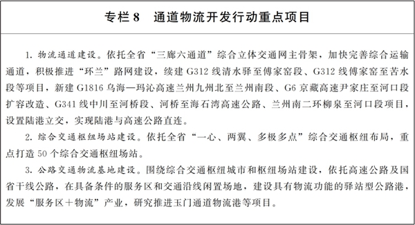 (八)實(shí)施通道物流開(kāi)發(fā)行動(dòng)。依托甘肅省“三廊六通道”綜合立體交通網(wǎng)建設(shè)及“一心、兩翼、多極多點(diǎn)”綜合交通樞紐系統(tǒng)布局,構(gòu)建完善以蘭州為中心,輻射西北、溝通西南、聯(lián)接中西亞、聯(lián)通東南亞的國(guó)際國(guó)內(nèi)雙循環(huán)現(xiàn)代物流網(wǎng)絡(luò),主動(dòng)融入國(guó)家西部陸海新通道和成渝雙城經(jīng)濟(jì)圈,促進(jìn)經(jīng)濟(jì)循環(huán)流轉(zhuǎn)和物流產(chǎn)業(yè)關(guān)聯(lián)暢通,變“交通通道”為“物流通道”,為強(qiáng)省會(huì)行動(dòng)提供有力支撐。(省發(fā)展改革委牽頭,省交通運(yùn)輸廳、省政府國(guó)資委按職責(zé)分工負(fù)責(zé))