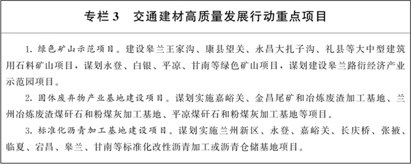 《計(jì)劃》明確,實(shí)施交通建材高質(zhì)量發(fā)展行動(dòng)。踐行綠色發(fā)展理念,突出資源節(jié)約與循環(huán)利用,布局建設(shè)一批千萬(wàn)噸級(jí)大型精品砂石示范性綠色礦山項(xiàng)目,大力發(fā)展改性瀝青、固廢利用等交通建材產(chǎn)業(yè),發(fā)揮交通企業(yè)發(fā)展“黑白料”保供穩(wěn)價(jià)行業(yè)擔(dān)當(dāng),保障重點(diǎn)工程建設(shè),帶動(dòng)區(qū)域內(nèi)砂石材料及深加工產(chǎn)業(yè)鏈發(fā)展,推動(dòng)甘肅省瀝青、砂石料及固廢利用產(chǎn)業(yè)高質(zhì)量發(fā)展。