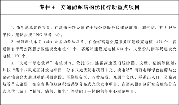 (四)實(shí)施交通能源結(jié)構(gòu)優(yōu)化行動(dòng)。聚焦落實(shí)“雙碳”目標(biāo),開(kāi)展“交通+綠色能源”融合發(fā)展模式、實(shí)現(xiàn)路徑及關(guān)鍵技術(shù)研究,打好清潔能源綠色牌,優(yōu)化交通能源結(jié)構(gòu),促進(jìn)公路貨運(yùn)節(jié)能減排。推進(jìn)高速公路、國(guó)省干線服務(wù)區(qū)加油(氣)站點(diǎn)加密織網(wǎng),形成油氣供應(yīng)為主、電氫能源補(bǔ)充替代的交通能源多元互補(bǔ)發(fā)展格局。(省發(fā)展改革委、省交通運(yùn)輸廳牽頭,省政府國(guó)資委按職責(zé)分工負(fù)責(zé))