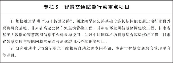 2,實(shí)施協(xié)同創(chuàng)新的智慧產(chǎn)業(yè)項(xiàng)目。高標(biāo)準(zhǔn)建設(shè)甘肅省智慧交通重點(diǎn)實(shí)驗(yàn)室和甘肅人工智能創(chuàng)新中心,加快智慧交通領(lǐng)域新技術(shù)、新設(shè)備研發(fā)應(yīng)用。有序推進(jìn)“云網(wǎng)融合”公路網(wǎng)運(yùn)行監(jiān)測(cè)體系、西北寒旱區(qū)公路基礎(chǔ)設(shè)施性能野外科學(xué)觀測(cè)研究基地等項(xiàng)目。