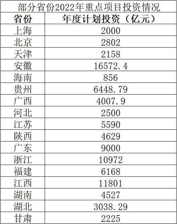 截至目前,全國(guó)已有19個(gè)省市區(qū)公布了2022年重點(diǎn)項(xiàng)目投資計(jì)劃清單,包括北京、上海、天津、廣東、江蘇、浙江、四川、貴州、河北、安徽等。其中,安徽、江西、浙江三省年度計(jì)劃投資均超萬億元。
