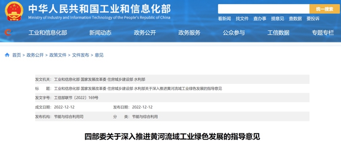 12月12日,工業(yè)和信息化部、國家發(fā)展改革委、住房城鄉(xiāng)建設(shè)部、水利部四部門聯(lián)合發(fā)布《關(guān)于深入推進(jìn)黃河流域工業(yè)綠色發(fā)展的指導(dǎo)意見》,以下簡(jiǎn)稱《意見》。