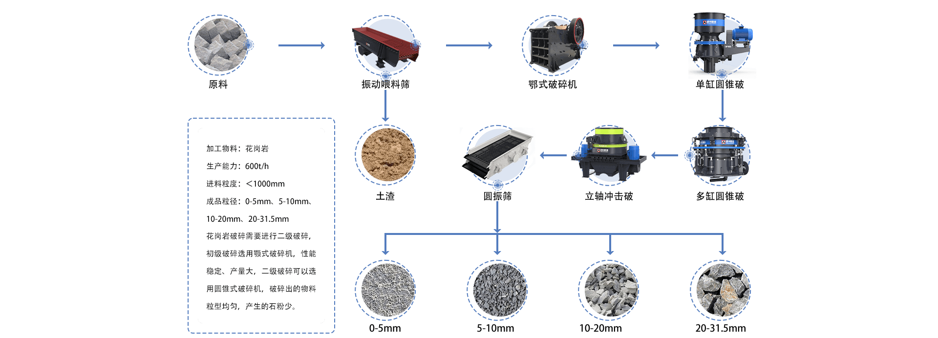花崗巖破碎需要進(jìn)行二級破碎,初級破碎選用顎式破碎機(jī),性能穩(wěn)定,產(chǎn)量大,二級破碎可以選用圓錐式破碎機(jī),破碎出的物料粒型均勻,產(chǎn)生的石粉少。